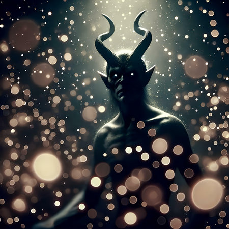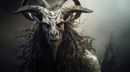 Fantasy horned demon with intricate details surrounded by a mystical atmosphere. Concept of mythology, fantasy character, dark magic, mythical being. Halloween. Halloween.