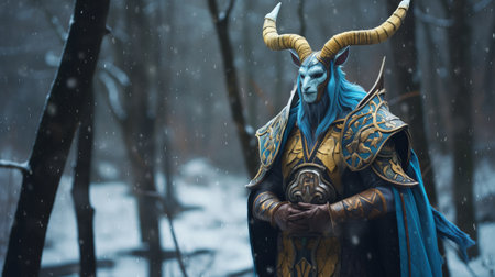 a warrior, adorned with a horn cap and robe, stands confidently in a tree amidst a wooded backdrop. created in the style of light turquoise and dark gold, this striking image showcases the artist's skill in zbrush. the warrior's strong facial expression adds intensity to the scene, while the snowy surroundings create a captivating atmosphere. this artwork, a contest winner, exemplifies precision painting and was