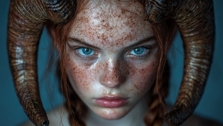 A striking portrait of a woman with freckles and ram horns.