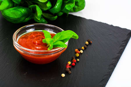 Green Fresh Basil with Tomato Sause and Ketchup Studio Photo