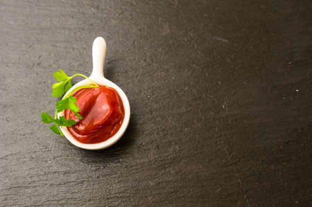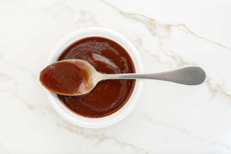 Ketchup sauce in a bowl and spoon on white marble table. Top view
