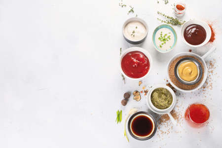 Set of different sauces - ketchup, mayonnaise, barbecue, soy, chutney, wasabi, adjika, horseradish, aioli, marinara. Trendy hard light, dark shadow. White putty background, copy space