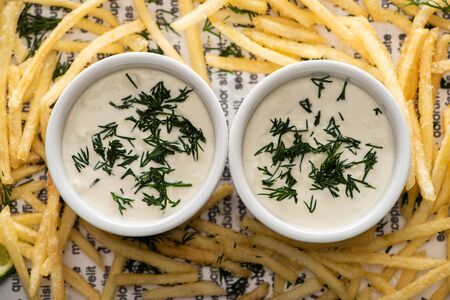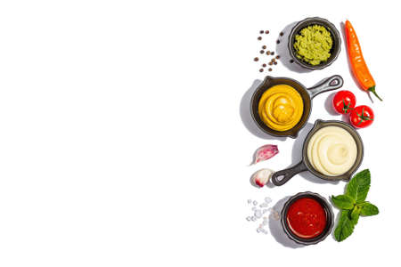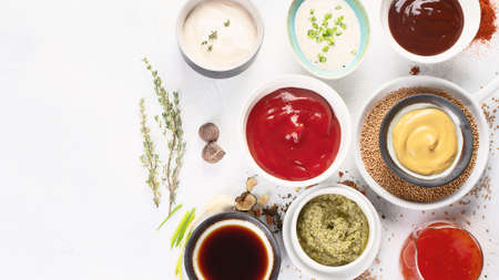 Assortment of different classic sauces and dips in sauceboats. Mayonnaise, ketchup, tartare, mustard, pesto, sour cream, barbecue sauces with spices, herbs, lemon