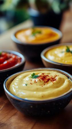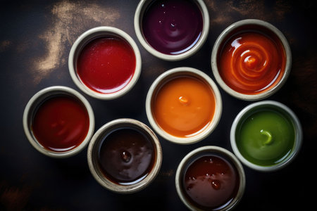 A visually appealing arrangement of various sauces and condiments in small bowls, showcasing a rich diversity of flavors and textures for culinary adventures.