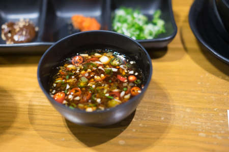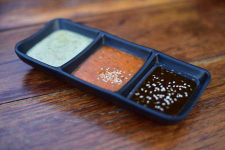Assorted sauces in black bowls on wooden table, culinary presentation