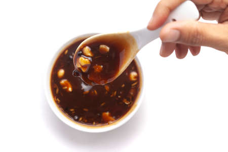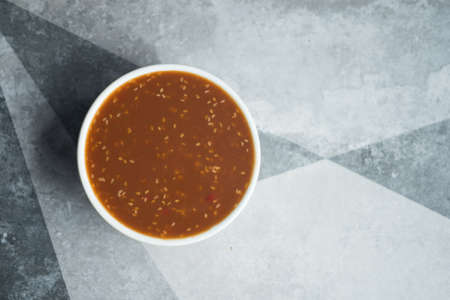 Close-up of mango dry fruits sweet red dark chutney used in Indian chaat and fast food in white ceramic bowl.
