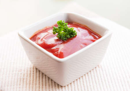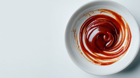 A photograph of a pristine white ceramic bowl filled with vibrant, rich ketchup