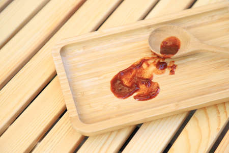 Dirty spicy sauce stain on wooden tray from using in serving. photo for cleaning concept of houeswork and clean tool product