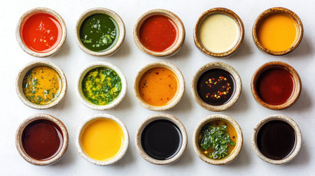 A selection of colorful sauces in small rustic bowls, artfully arranged on a clean white surface, viewed from above, perfect for culinary presentations