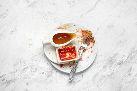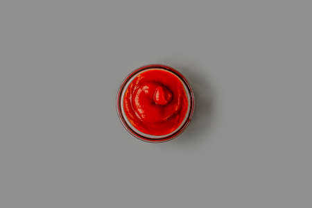 Gravy boat with ketchup on a gray background, top view. Isolated.