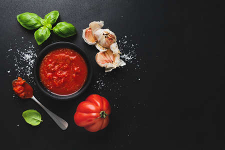 Italian food background with vegetables and tomato sauce on dark background. Top view.