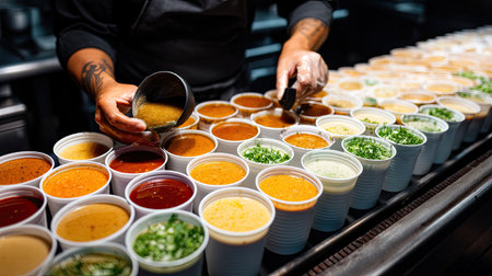 A chef prepares an array of vibrant sauces in clear containers lined up on a metal countertop, showcasing the artistry of culinary creation and flavor.