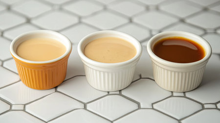 A tasting flight of sauces, each created with the same base ingredient but with different preparations and seasonings: allowing the diner to appreciate the nuances of flavor that can be achieved through varying cooking methods and flavor profiles, and exploring the power of sauce as a culinary medium, presented in a minimalist and educational way, and ready to be savored and compared, isolated on a clean white background.