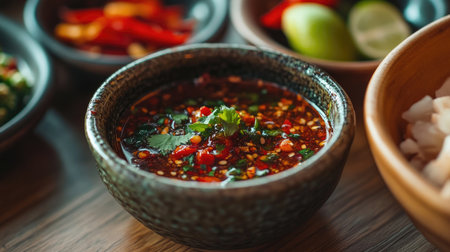 A vibrant bowl of spicy sauce filled with fresh herbs and chili, surrounded by colorful ingredients. Perfect for culinary enthusiasts and food lovers.