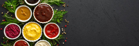 Set of sauces in bowls - ketchup, mayonnaise, mustard, soy sauce, bbq sauce, pesto, chimichurri, mustard grains on dark stone background. Top view copy space.