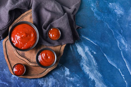 Three kinds of red tomato sauce on a white stone table: traditional classic ketchup, barbecue sauce, sweet and sour Chinese sauce. Top view copy space