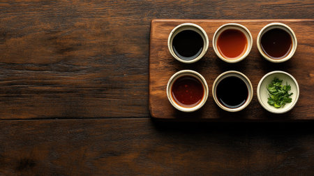 A stunning display of various sauces and spices in small bowls, beautifully arranged on a wooden tray. Perfect for showcasing culinary creativity and flavors in food photography.