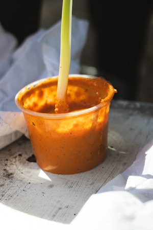 Hot Spicy Aioli Sauce in Plastic Cup. Take Away Fast Food Side Dish. Ready to Eat.