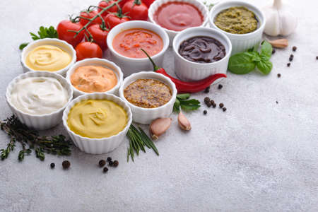 Set of sauces, pesto sauce, tomato sauce, barbecue sauce, mustard, mayonnaise, guacomole sauce against the background of a gray stone table