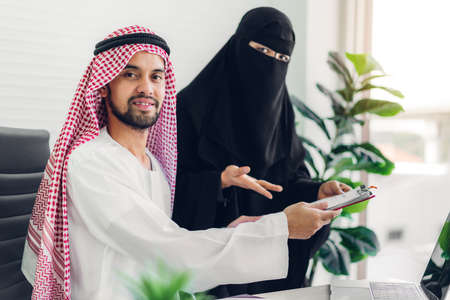 muslim business partner discussing and meeting using laptop pc presenting project
