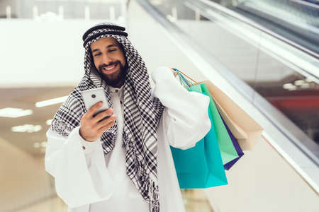 Young Arabian Man Using Cell Phone in Modern Mall.