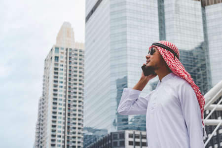 Handsome modern Arabian man standing in modern city wear muslim dress headscarf eastern ethnic smile outside office. Arab Man looking plan new project while walking in big city. Business successful