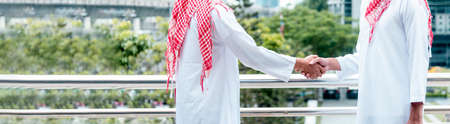 Banner Arab Businessman Muslim dress shaking hands together. Panorama Muslim Men Teamwork business partner handshake teams Partnership. multiracial UAE diversity people trust honesty with copy space
