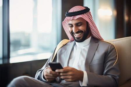 A saudi businessman sitting with mobile phone and smiling. Success person concept