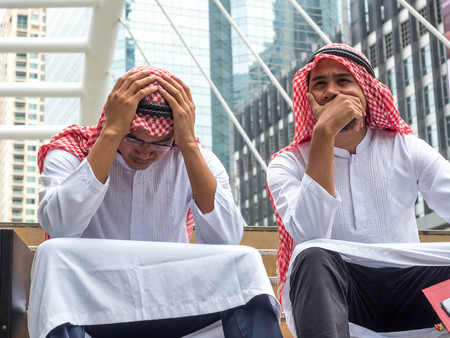 Two Arabic muslim wear white shirt sit on the stairs worried about business is not successful.