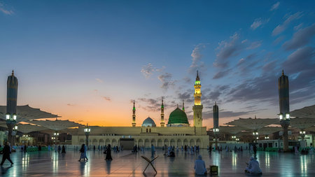 A mosque is illuminated against a twilight sky, showcasing multiple minarets and a central dome. The composition features a symmetrical arrangement, with silhouettes of people adding scale. The scene is bathed in cool and warm tones, possibly suitable for editorial use or cultural representation.