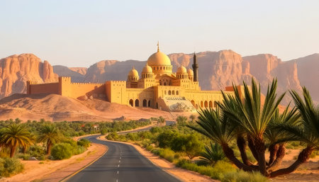 Palm date trees lining both sides of a road, with their shadows cast on the asphalt and a vibrant sky above, creating a picturesque roadside scene