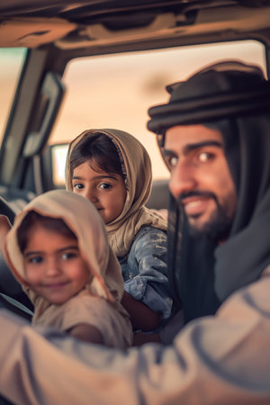 Happy Family Road Trip in Middle Eastern Desert at Sunset.