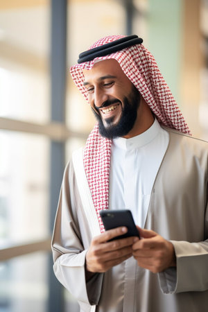A saudi businessman sitting with mobile phone and smiling. Success person concept