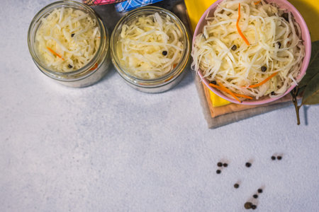 Homemade sauerkraut. Fermented food. Sauerkraut with carrots in a bowl on a concrete gray background. Top view, flat lay. Copy space.