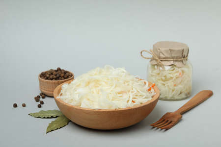 Bowl of sauerkraut and ingredients on light gray background