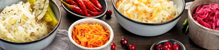 Pickled vegetables on wooden background. Salting vegetables. panorama