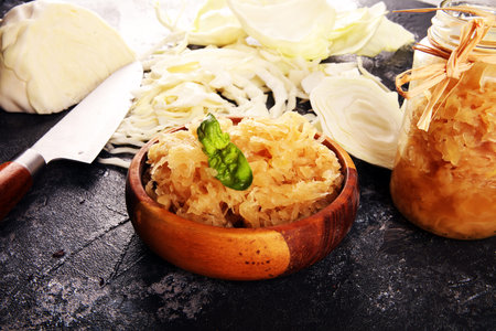 Homemade sauerkraut in a plate and in a glass jar. Healthy fermented food.