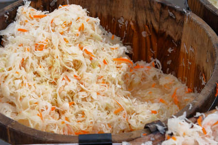 Fermented preserved vegetarian healthy food concept. Sauerkraut with orange carrots in wooden container is sold by weight in local market.
