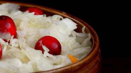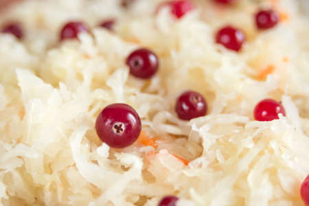 Sauerkraut with cranberries close-up. Fermented vegetables. Super product for proper nutrition. Closeup.
