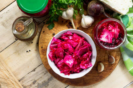Homemade preserving. Fermented food. Salad Cabbage with Beetroot on the kitchen wooden background.