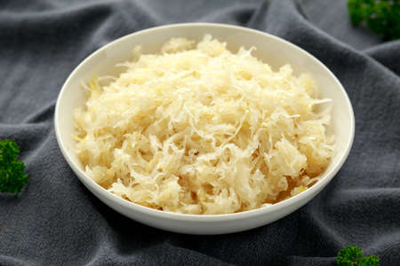 german sauerkraut (white fermented cabbage). Prepare sliced or cut vegetable for cooking cabbage salad or coleslaw. Homemade organic food concept.