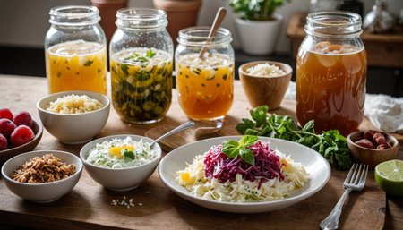 A rustic kitchen scene features a glass jar of fermented vegetables, surrounded by fresh produce and herbs, evoking a sense of healthy living and traditional cooking.