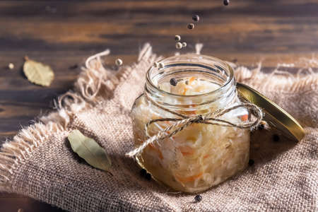 fermented sauerkraut village vegan salad in a glass jar. healthy product. rustic food. Probiotics concept.