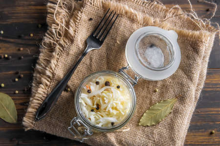 Sauerkraut in open glass mason jar. The best natural probiotic. Pickling cabbage at home on table. Homemade kraut, copy space for text.