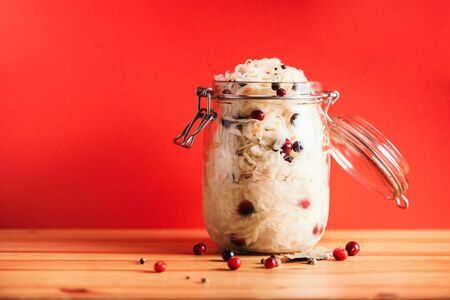 Sauerkraut in glass jar on red and wooden background with copy space. Fermented and marinated cabbage at home. The best natural probiotic food.