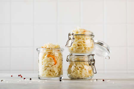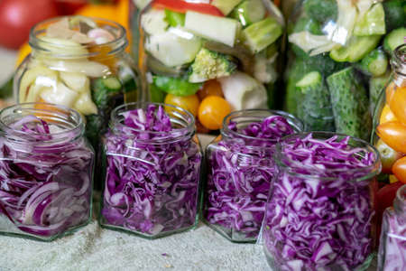 Sauerkraut in glass jars. Fermentation and canning of vegetables.