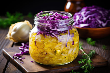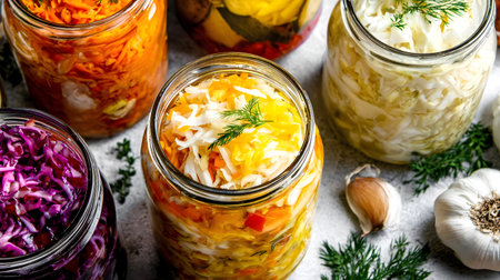 Vibrant jars of fermented vegetables, featuring layers of cabbage and carrots, arranged on a rustic surface with fresh herbs and garlic, highlighting healthy food preparation