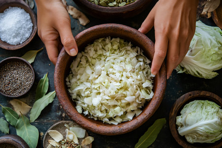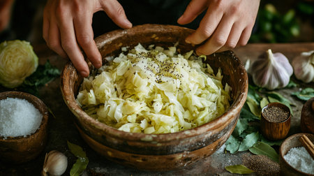 Chef is adding spices to a wooden bowl of sauerkraut, with ingredients surrounding it on a wooden table