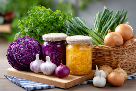 Glass jars with homemade preserves such as red cabbage and sauerkraut, surrounded by fresh vegetables like onions, garlic, parsley and chives