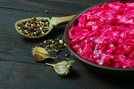 Fermented red cabbage. Sauerkraut and spices on a wooden table.